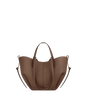 This sculptured compact tote bag featuring waves, folds, and curves can be used in two ways. Basket-style, with its sides open and straps on the outside, or As a flower-like closed bag, with its sides tucked in and its straps crossed on the inside.