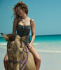 Inspired by 1950s swimwear, the Adrielle Maillot is a classic one-piece crafted from a stretchy seersucker adorned with our La Maddalena Gingham and fully lined for a smooth fit. With a square neckline, medium coverage cut, and stretchy grosgrain straps, it’s detailed with black floral eyelet embroidery, contrast piping, and three fixed bows that extend down the bust. Zigzag stitches adorn the edges.